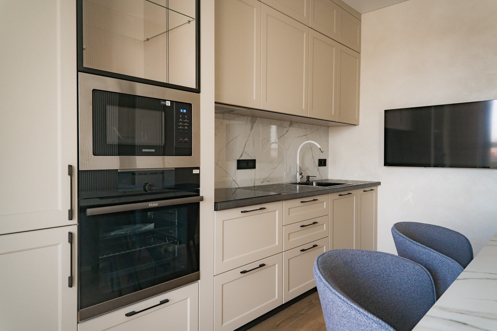 — В стоимость квартиры включёна вся мебель и бытовая техника: стиральная машина, холодильник, посудомоечная машина, варочная панель, духовой шкаф, вытяжка, телевизоры, кондиционер!
